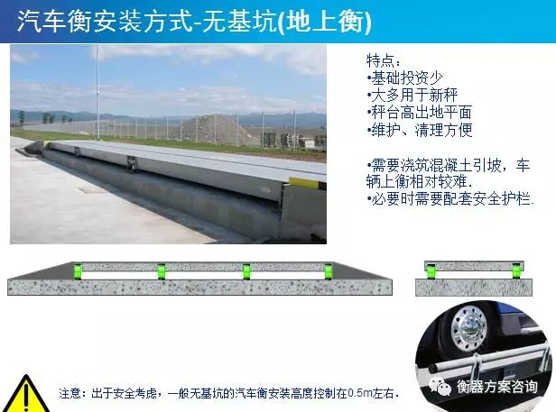 無(wú)基坑注意事項(xiàng):需要澆筑混凝土引坡,車(chē)輛上衡相對(duì)較難.必要時(shí)需要配套安全護(hù)欄。出于安全考慮,一般無(wú)基坑的汽車(chē)衡安裝高度控制在0.5m左右。